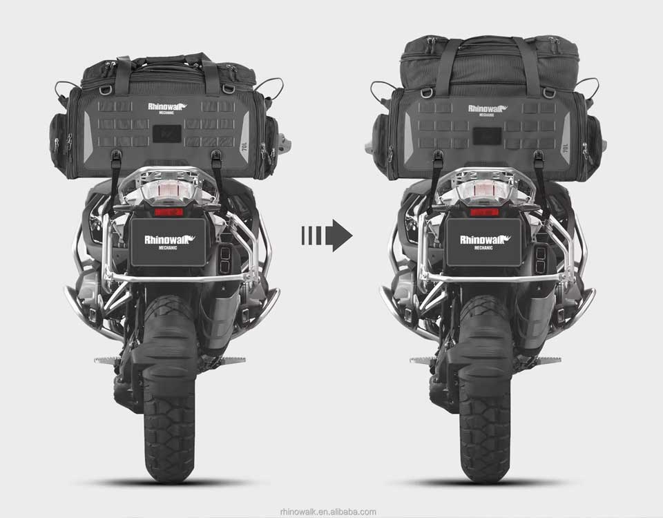 Rhinowalk Mechanic 50-70L motosiklet arka çantası; kapalı halde 50 litre, tam açık haliyle 70 litreye varan genişletilebilir hacmi, dayanıklı yapısı ve çok yönlü kullanımıyla uzun motosiklet yolculuklarınızda eşyalarınızı güvenle taşır.