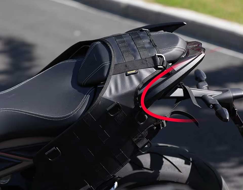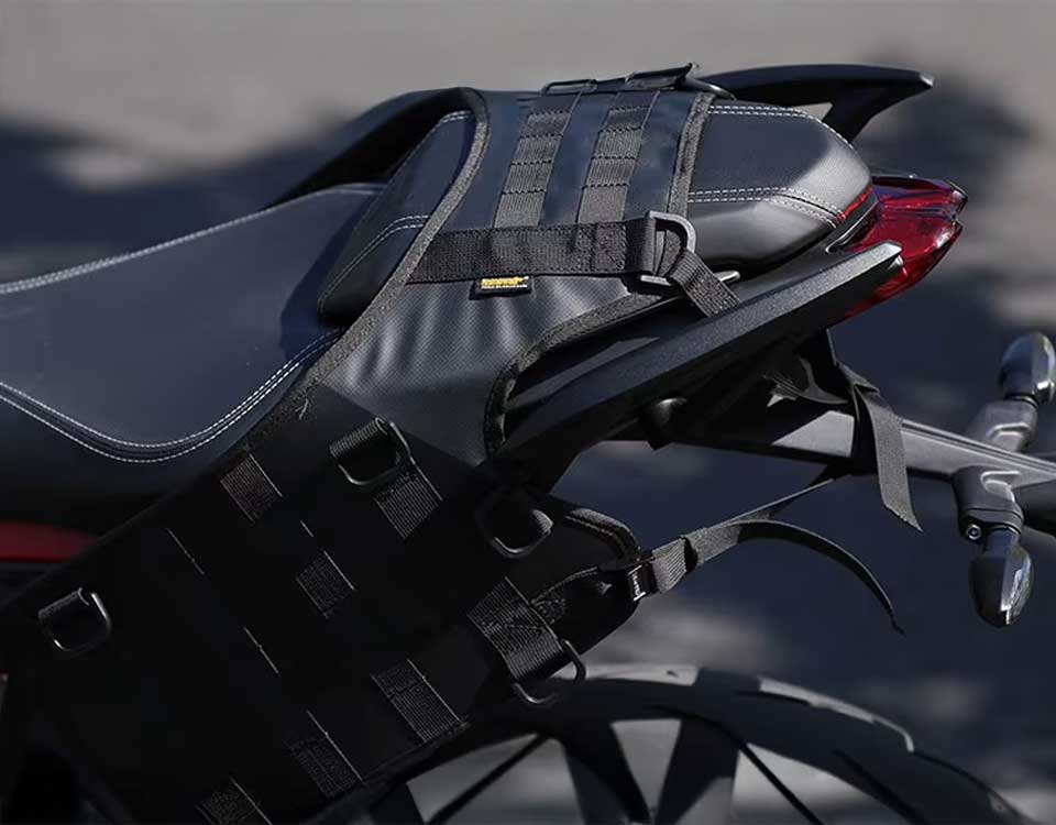 Özel bir malzemeden üretilmiş kalınlaştırılmış D-Ring bağlantıları sayesinde çantalarınız bu bağlantı tabanı üstüne mükemmel bir şekilde sabitlenecek. Bağlantı tabanının yırtılmaya karşı son derece dirençli olan ana malzemesi, kaymayı da engelleyerek çantalarınızın sabit durmasını sağlıyor.